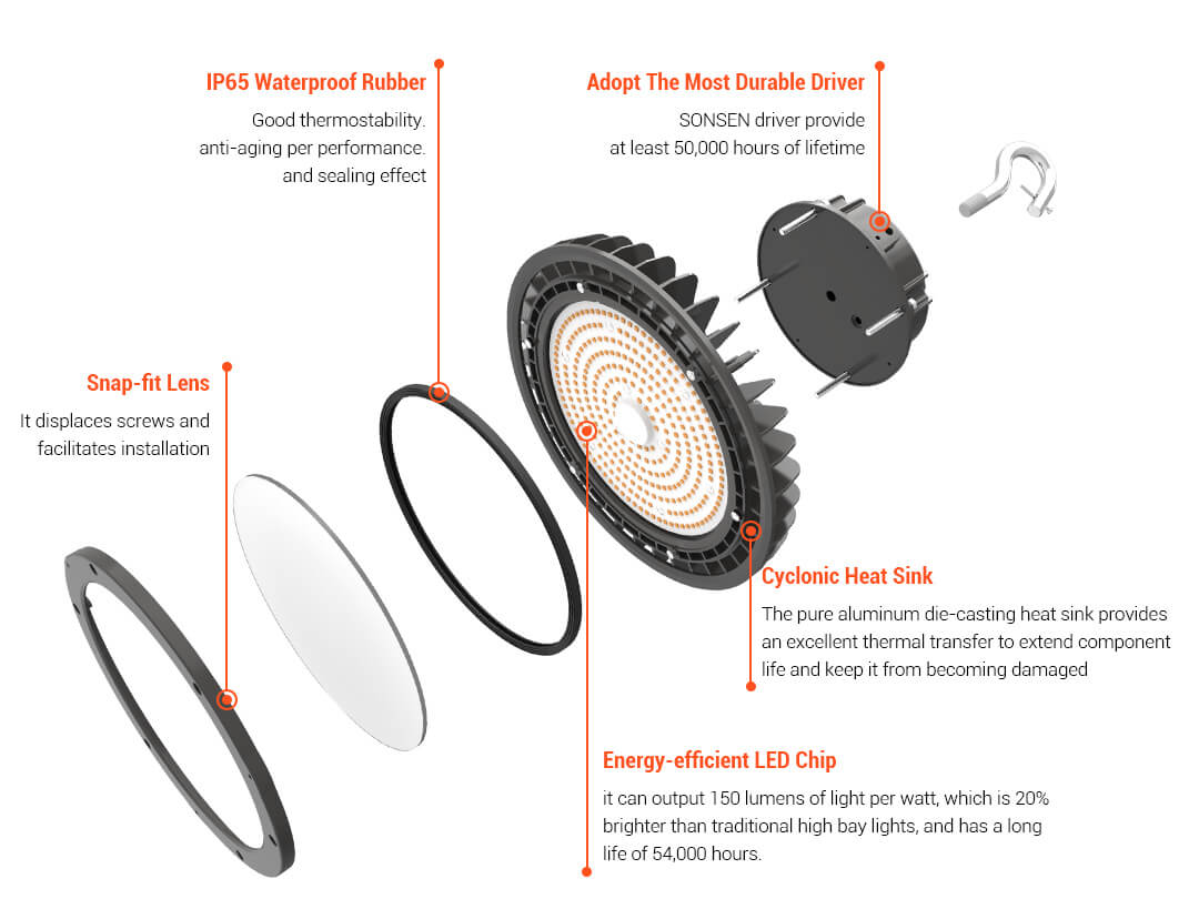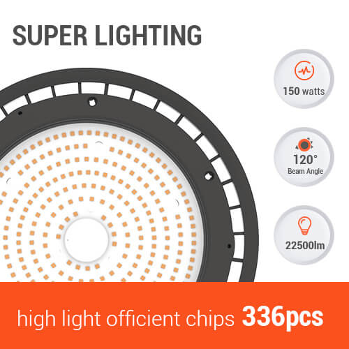 Ovo 150-watt UFO LED High-Bay svjetlo zamjenjuje 600-watt metal-halogena svjetla i traje 4 puta duže. Snažni uređaj emituje 22.500 lumena hladnog bijelog svjetla. U poređenju sa tradicionalnim izvornim tehnologijama, naša LED svjetla za trgovine mogu uštedjeti do 80 posto energije.